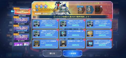 | SEED DESTINYのステージ15をクリア | 水星の魔女のステージ8をクリア | SEED DESTINYのRユニットを1回開発する |