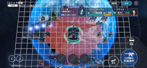 中央にいる味方戦艦の周囲は攻撃力アップ効果があるので、赤い範囲内で戦うようにしましょう