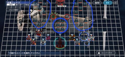 1ターン目に青枠に囲わている敵を全て倒しましょう