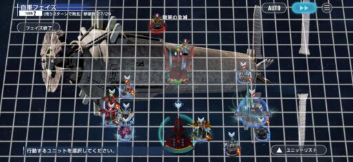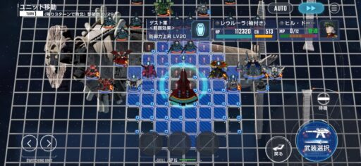 戦艦レウルーラを画像位置に移動させてネオジオングが防御アップ範囲に入るようにしましょう