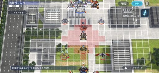 中央にあるユニットの赤い周囲は攻撃力アップ効果があるので、その範囲内で戦いましょう