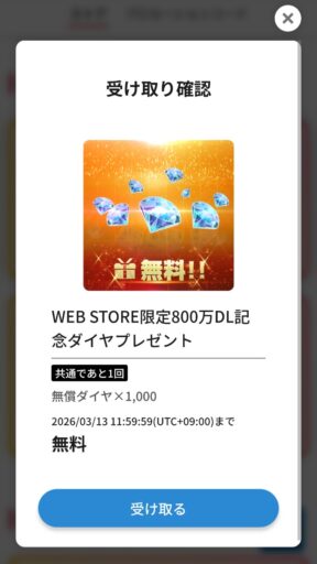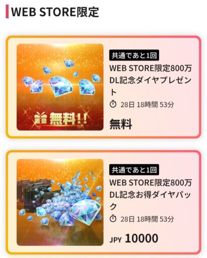 ジージェネ エターナル 800万DLを記念してWEB STOREにてダイヤ1000個を無料で入手可能となっています