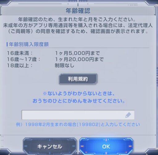 年齢確認はゲーム内のみでバンダイナムコIDやWEB STOREでの年齢確認はないので簡単です