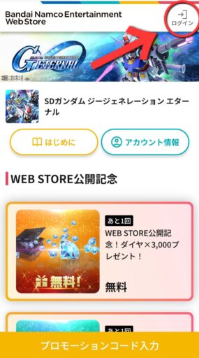 WEB STOREを開いたら画面右上のログインをタップして、エターナルと連携しているバンダイナムコIDでログインしましょう